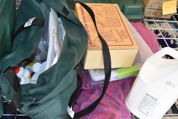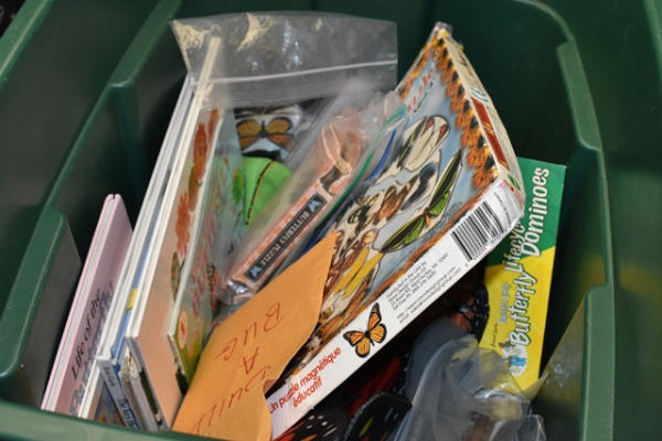 Shelving unit consisting of butterfly Dominos, butterfly puzzle, educational books and assorted washable chubby markers and school glue