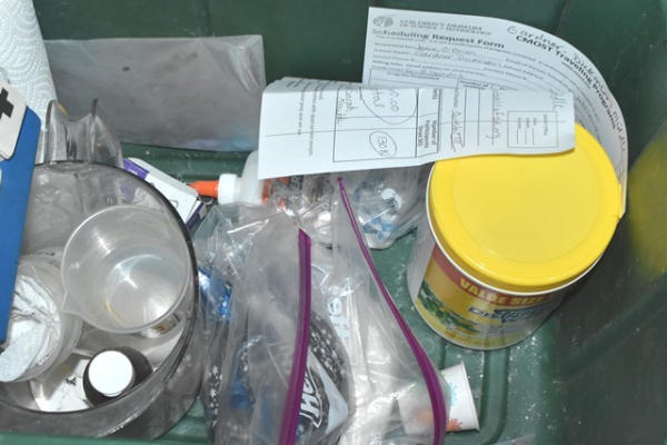 Shelf lot of pitcher, disinfecting wipes, etc.