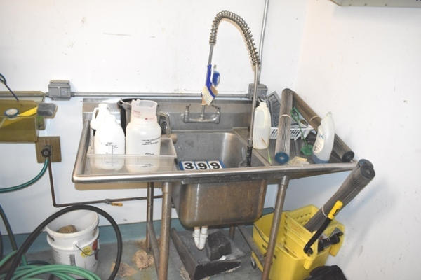 Single bay stainless steel sink with sprayer and 2 drying racks. Approx. 55" x 30" x 48" (CUSTOMER MUST REMOVE AND DISCONNECT AND CAP PLUMBING, CERTIFICATE OF INSURANCE IS REQUIRED)