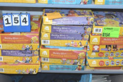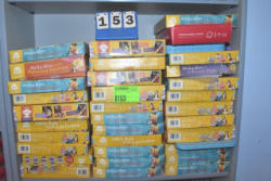 Shelf lot of assorted Dominoes, foam, puzzle pieces, educational books, etc.