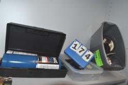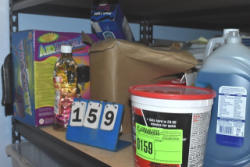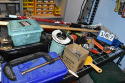 Shelf lot consisting of propane tank, fish string, paint brushes, 6-volt batteries, heat gun, etc.