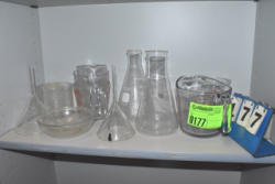 Lot of assorted glassware, Pyrex measuring cups, glass funnels, etc.