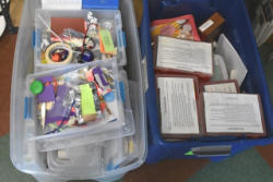 Tote consisting of assorted books: Animal Parts, Metamorphous of a Butterfly, floor puzzle, etc.