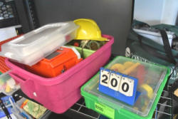 Tote lot consisting of assorted bowls, balloons, measuring cups, sandwich bags, and Junior Ranger Night Explorer kits