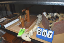 Shelving lot consisting of assorted bird's nests, fossils, brushes, etc.