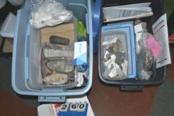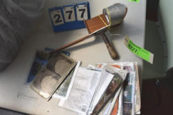 Shelf lot consisting of identified rocks, safety glasses, hammer and other artifacts