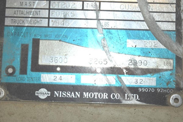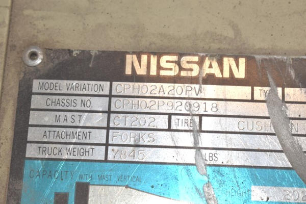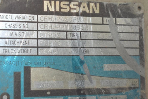 Nissan forklift, Model CPH02A20PV, SN: CPH02P920918, 3600 lb. capacity, truck weight is 7900 lbs., propane (tank not included), triple mast
