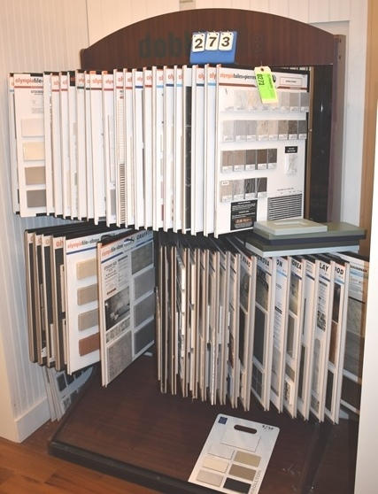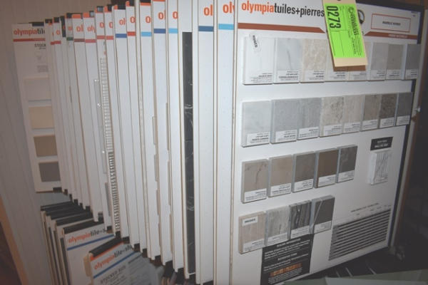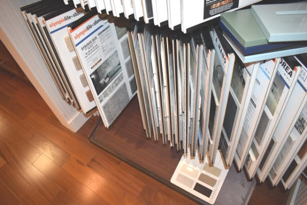 Sample rack with assorted samples of tile and granite