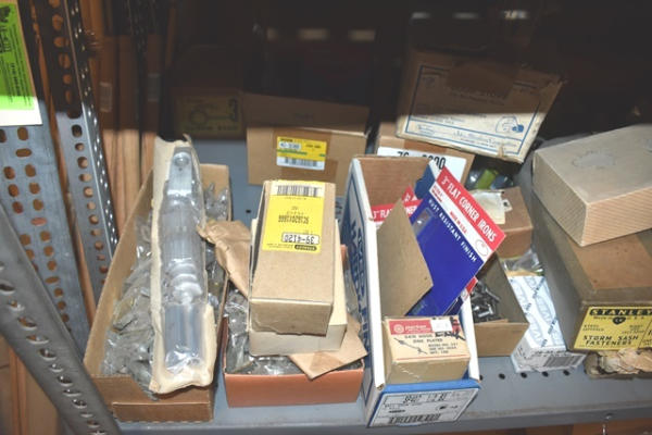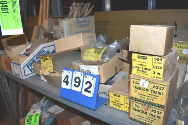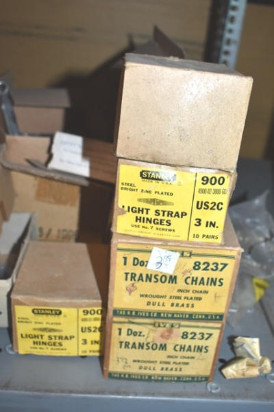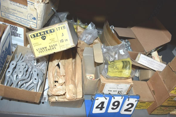 Shelf lot including storm sash fasteners, light strip hinges, small turnbuckles