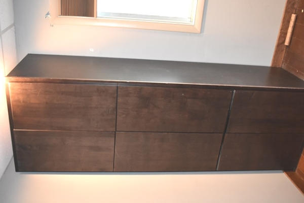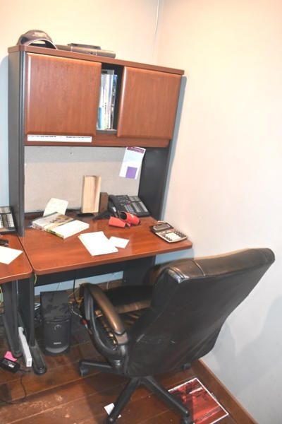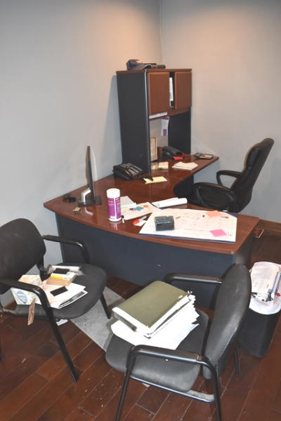 Approx. 60" x 79" desk and 6-door cabinet. Also includes 2 chairs, Dell computer tower and monitor