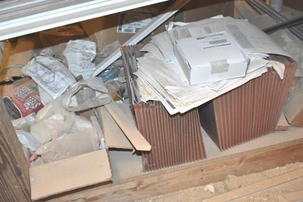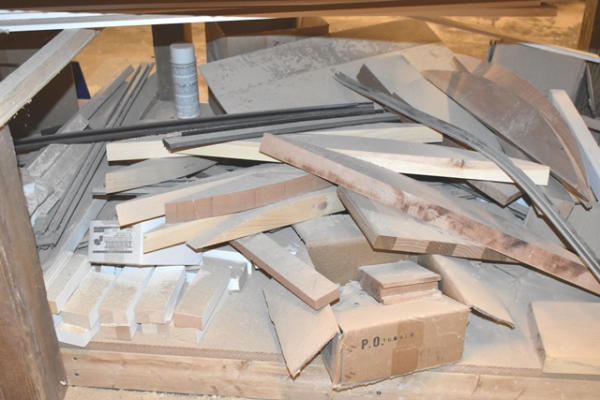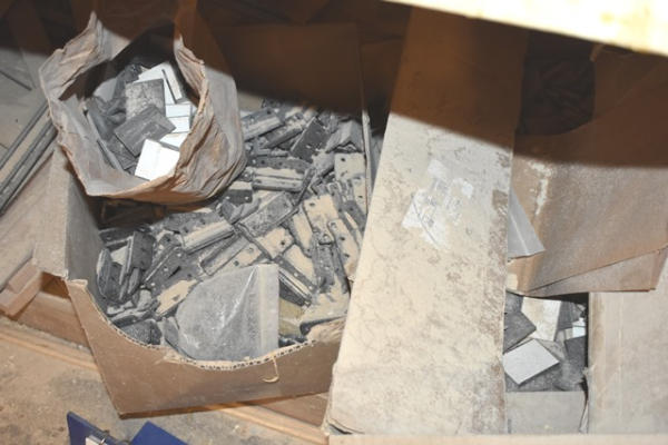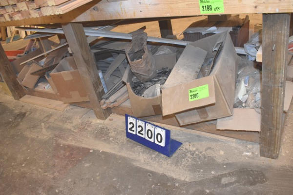 Under bench contents consisting of assorted door hardware, hinges, etc.