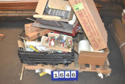 Work bench top contents consisting of staples, paint, stain, door knob parts, etc.