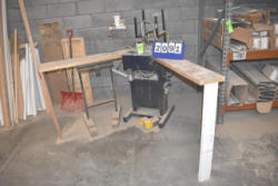 Work bench contents consisting of nails, screws, door latch pieces, square, hammer, etc.
