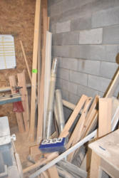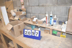 Contents of bench including door holding hardware, Bondo, caulk, nail screws
