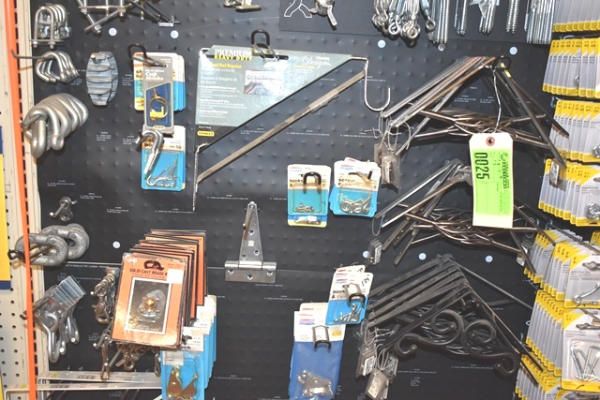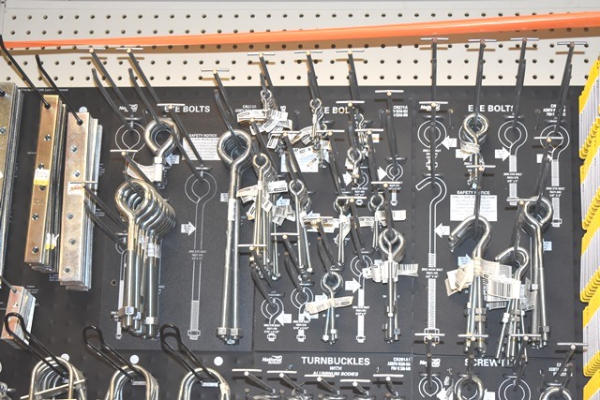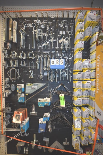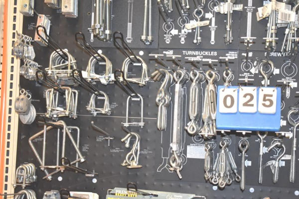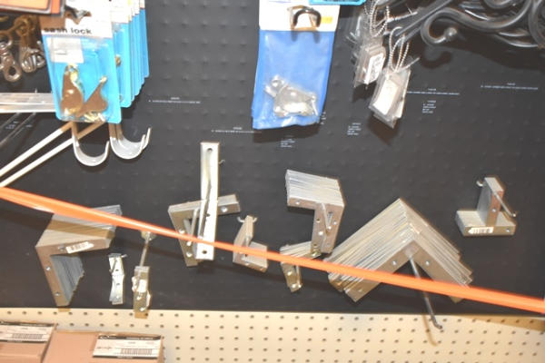 Large hardware lot consisting of turnbuckles, eye bolts, shelving brackets, hook latches