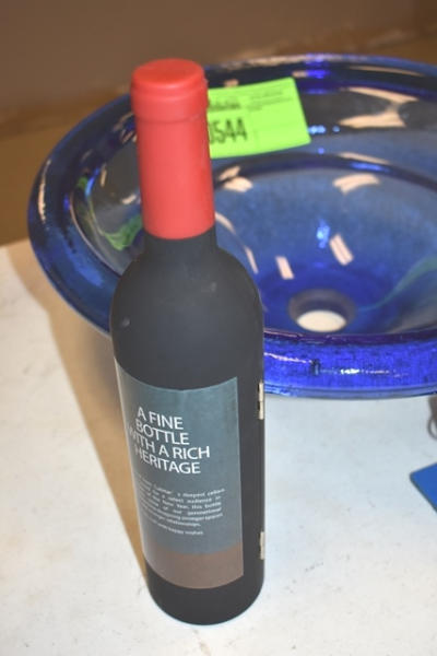 Sink with a wine bottle with corkscrew, etc. inside