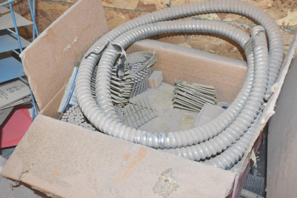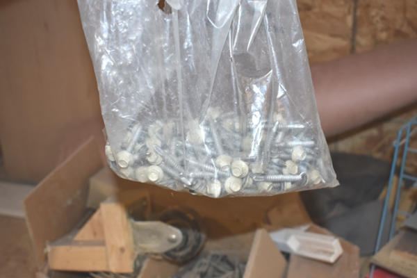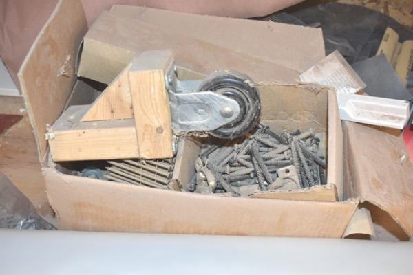 Bench top contents consisting of coil nails, hinges, sandpaper, screws, etc.
