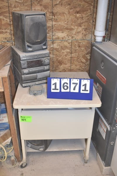 Printer stand with stereo, empty first aid kit boxes, etc.