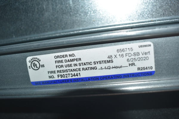 Type B vertical fire damper, 16" x 48"