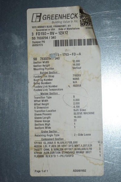 14" x 12" Type B fire damper, vertical mount