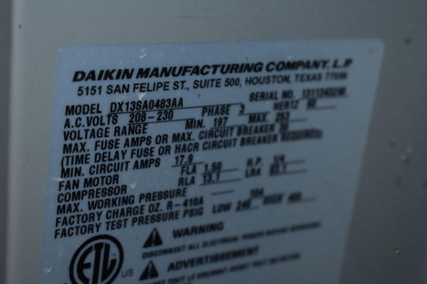Daikin Manufacturing Co. powered by Copland Scroll Model DX13SA0483AA, AC volts 208-230, 3 phase, 60 Hz, 4-ton air conditioning unit, uses R-410A refrigerant (CUSTOMER RESPONSIBLE FOR REMOVAL)