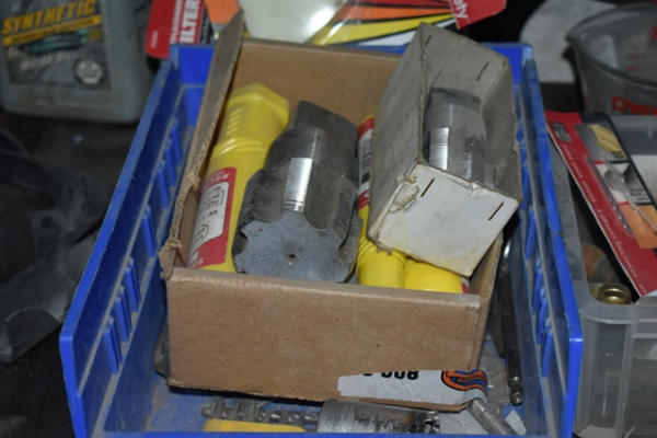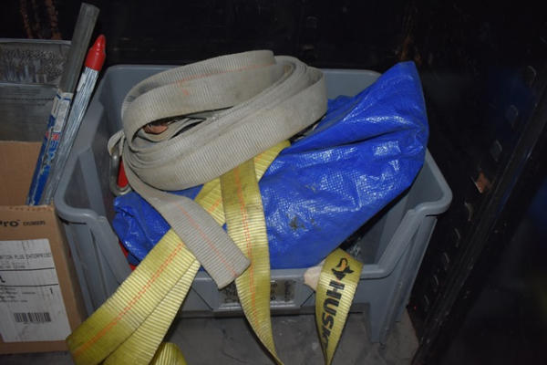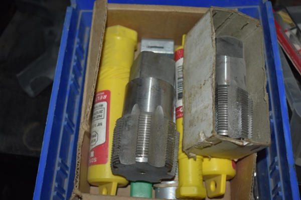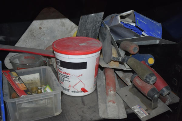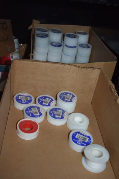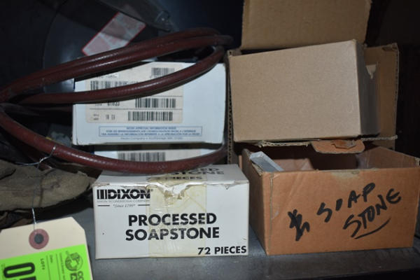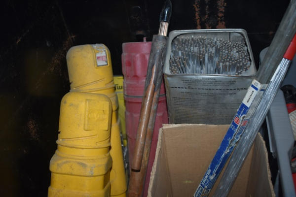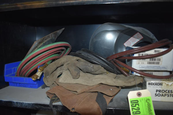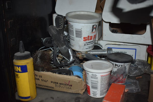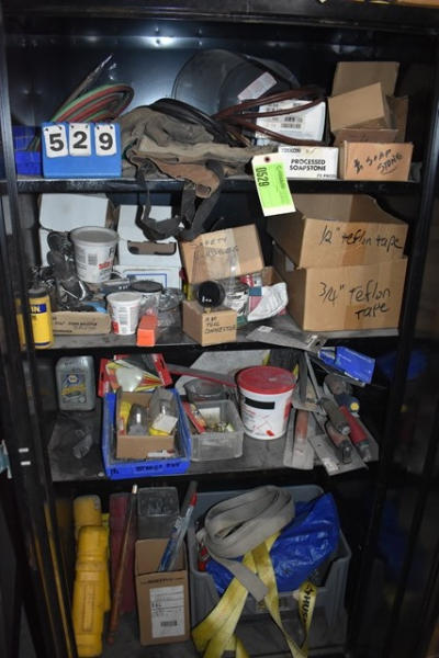 Cabinet contents (DOES NOT INCLUDE CABINET) consisting of soap stone, 1/2" Teflon tape, 3/4" Teflon tape, threading tap, welding hoses, gloves, etc.