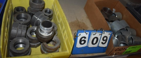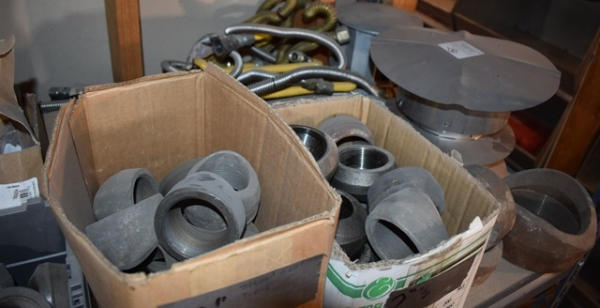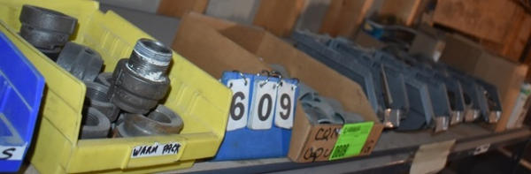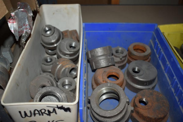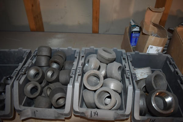 Shelf lot of assorted weld on bungs, 1/2", 3/4", 1" to what appears to be 4"