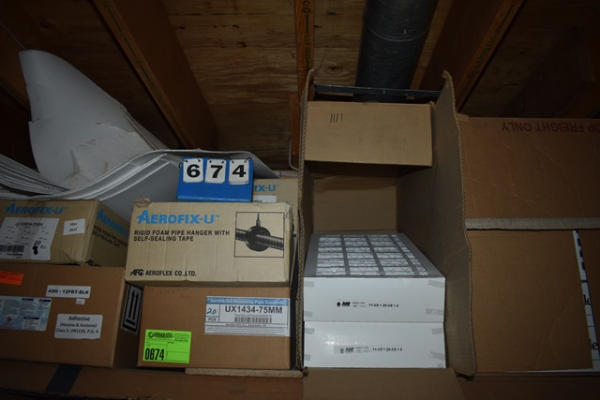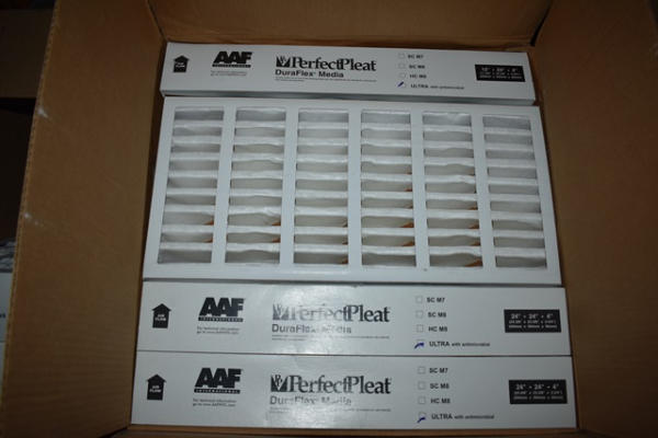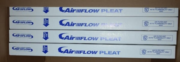 Shelf lot of furnace filters, 24" x 24" x 4", 24" x 24" x 2", etc.