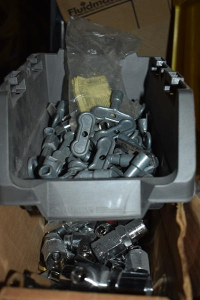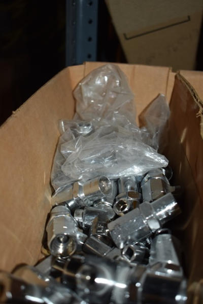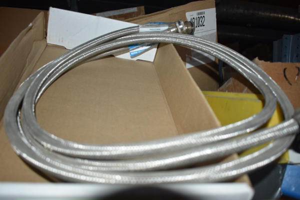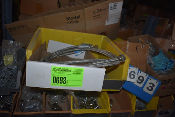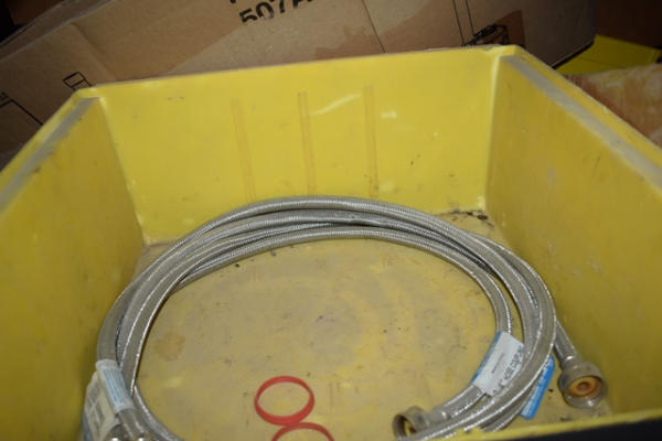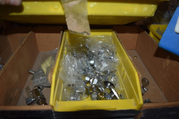 Shelf lot of assorted shut off valves, water feed lines, etc.