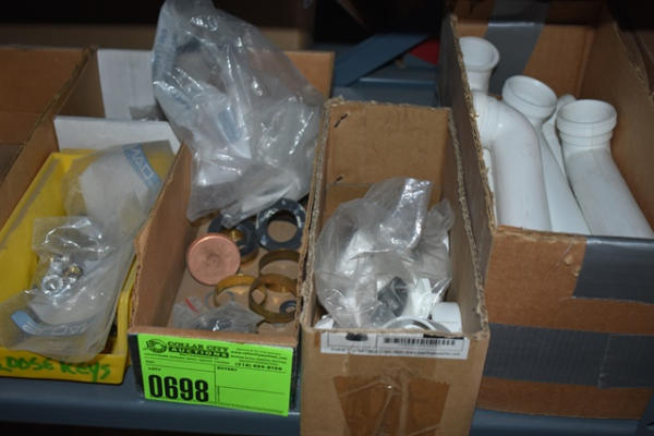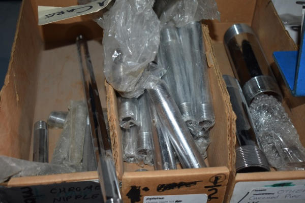 Shelf lot of assorted nipples, chrome plated, also includes drain parts