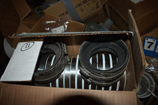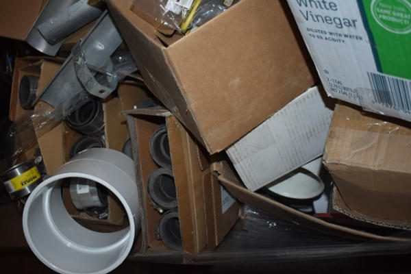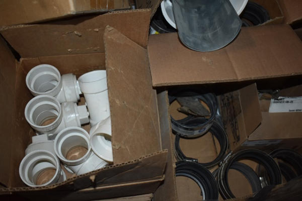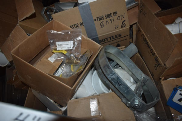 Pallet lot consisting of 3" PVC fittings, 2" PVC fittings, full port forge brass ball valves, 4" hubs, 6" PVC couplers, etc.