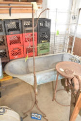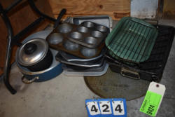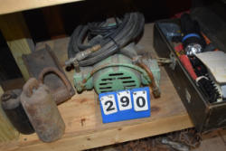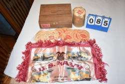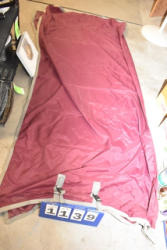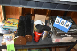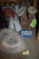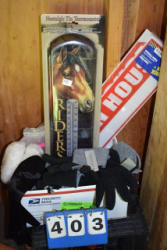 #1497 - Tote lot of shipping and fly boots, Baker fly boots, red shipper, 2 of 2 blue quilt, etc.