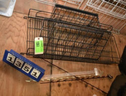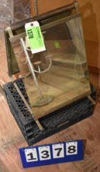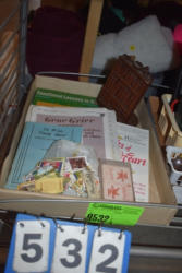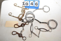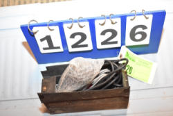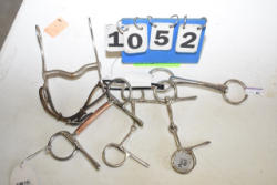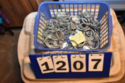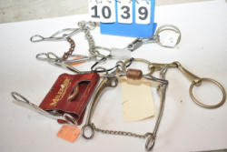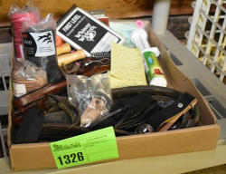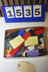#1535 - Box lot of assorted combs, leather saddle cross, breakaway stirrup, chain hooks, etc.