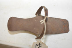 Lot of 3 10" large cast iron hooks, 1 5" hook, 1 4" hook and 1 old cow bell
