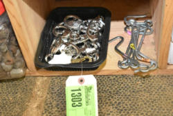 Box lot of assorted combs, leather saddle cross, breakaway stirrup, chain hooks, etc.