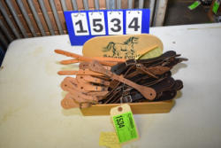 #1534 - Lot of spur straps in a wooden Soapie Ponies box including 8 piece natural color, 2 piece straight natural, 9 pair dark brown.