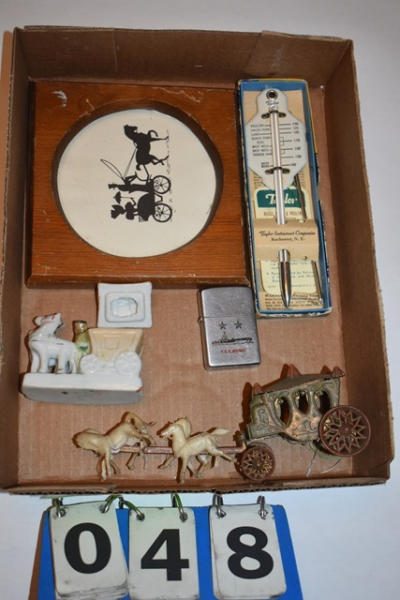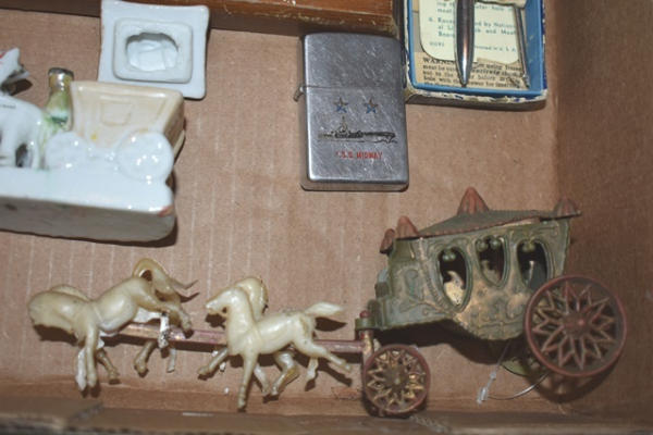 Box lot of knick knacks including horse and carriages in plastic and ceramic