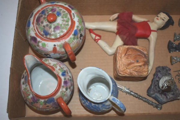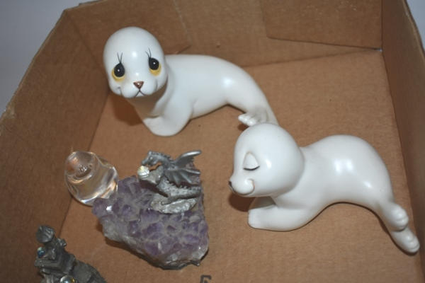 Box lot of knick knacks including seals, crystal, computer, sugar and creamer containers