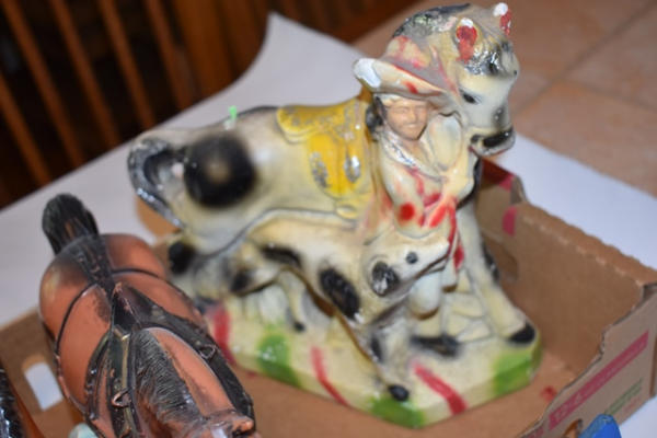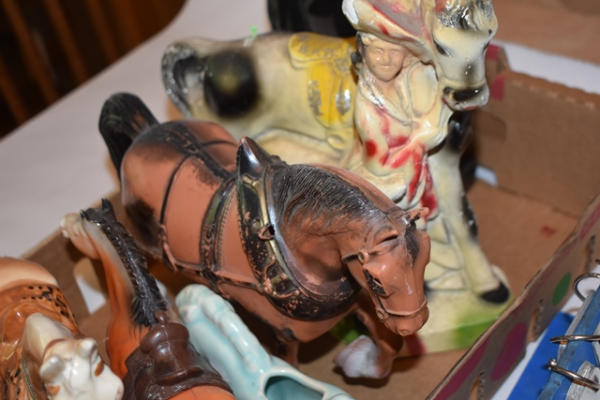 Lot of ceramic and plastic horses, including vintage chalkware