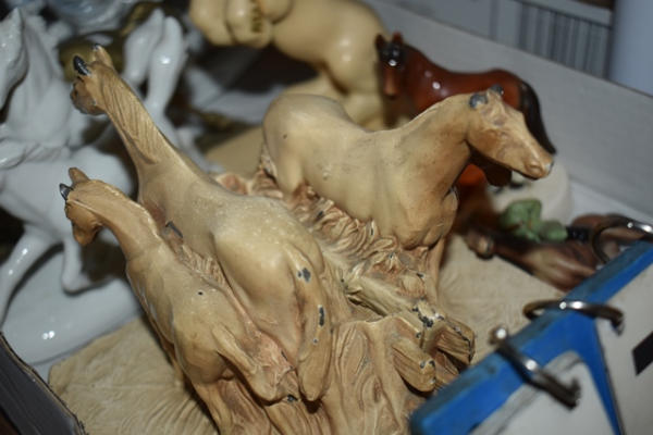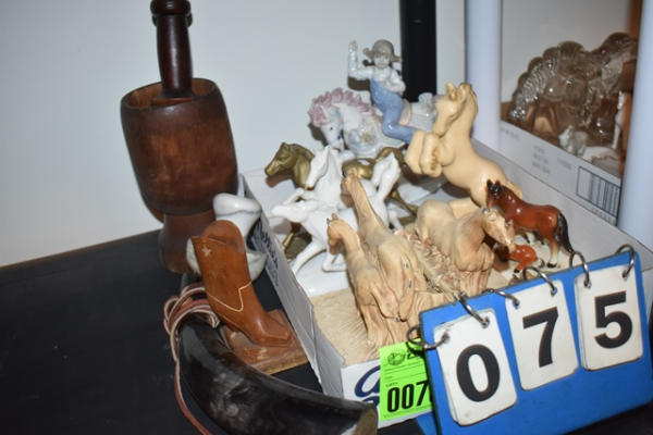 Large lot of horse items including ceramic bookends, ceramic horses, one appears to be brass, mortar and pestle