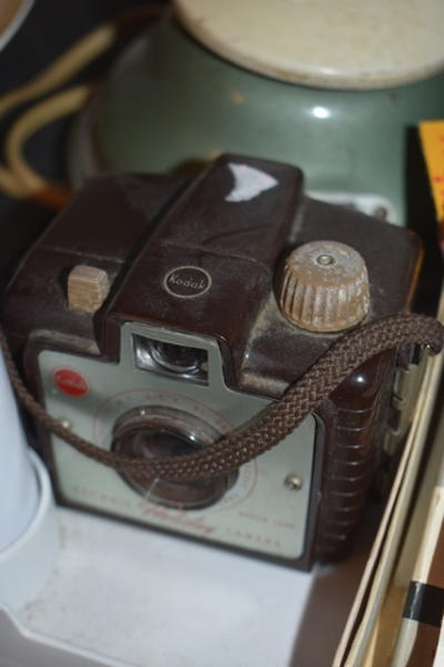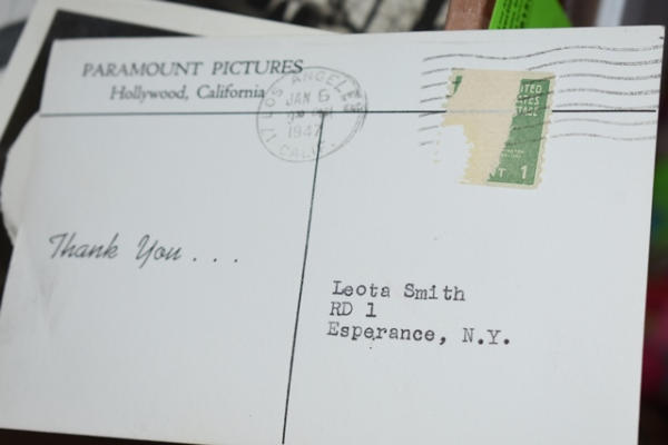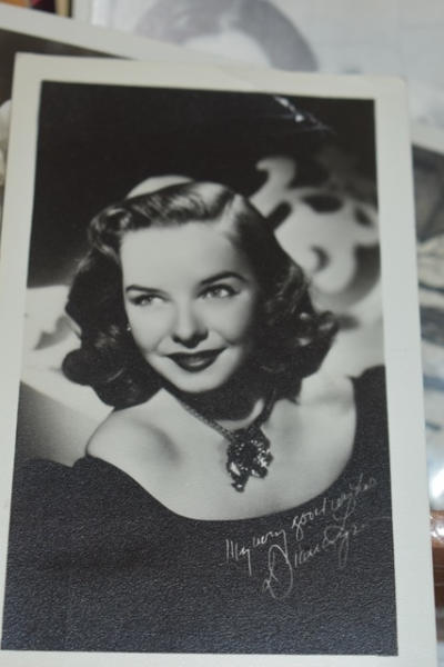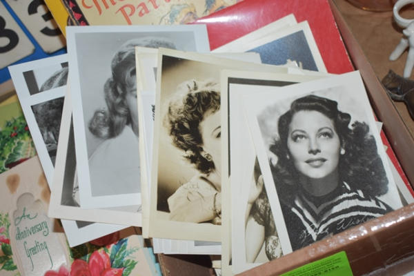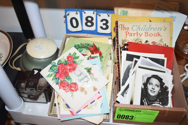 Lot of vintage prints, "The Children's Party Book", assorted cards (some autographed, Shirley Temple post cards, Tatum O'Neil, Judy Garland, Batman and Robin, Liz Taylor), vintage camera