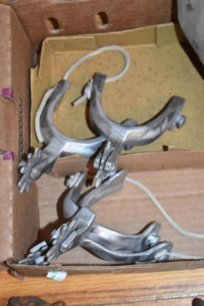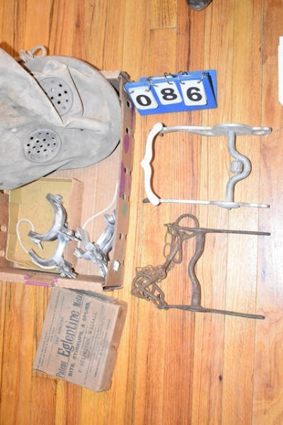 Box lot of assorted bits including Eglentine metal spurs, and a feed bag