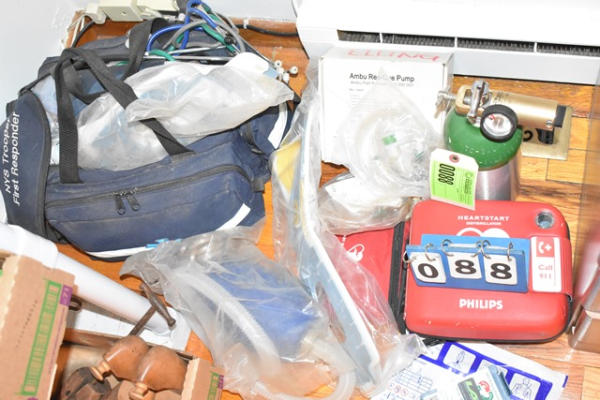 Medical lot including oxygen tank, heart start defibrillator (includes a new battery and new pads), also included bandages, OB Gyn kit, neck collar, New York State Trooper First Responder Kit