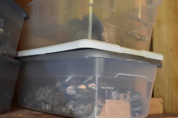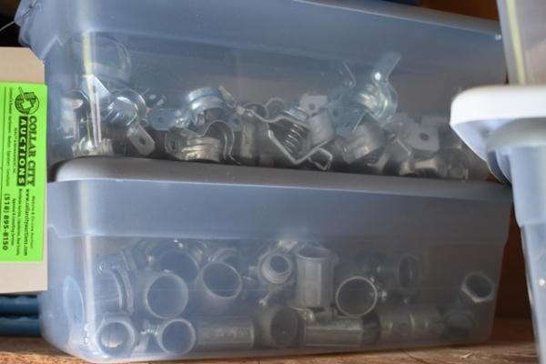Shelf lot of contents including electrical connectors, conduit strapping, cantles, etc.