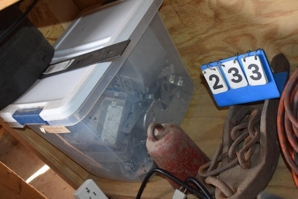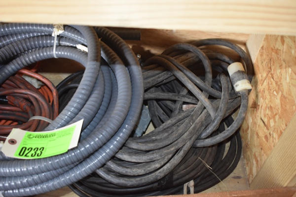 Shelf lot of lead cords, plastic conduit, electrical boxes, weight