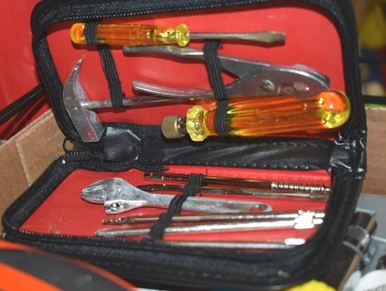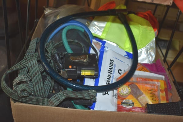 Rack with contents consisting of tools, bungee cords, screwdrivers, scissors, etc.