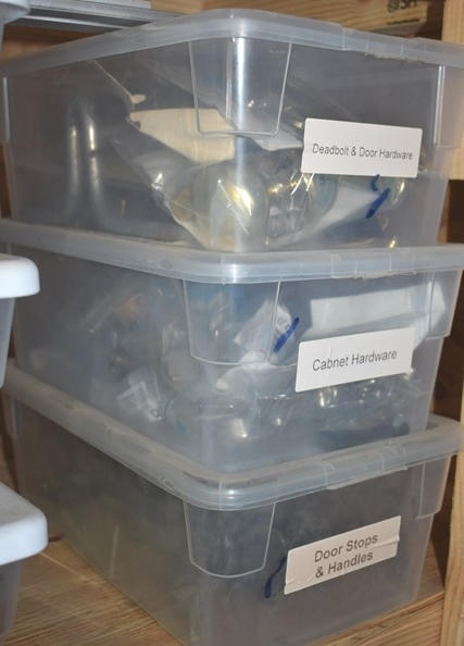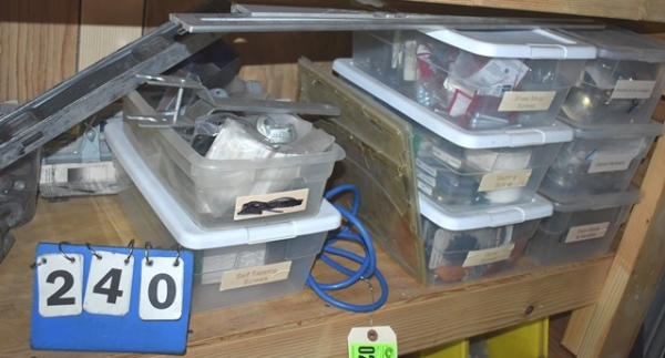 Shelf lot including deadbolt door handles, cabinet hardware, wood screws, hinges, level