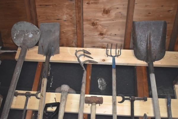 Wall lot of assorted rakes, shovel, loppers, etc.