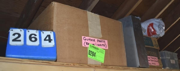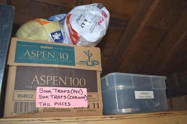 Shelf lot including Fernco, sink traps, gutter parts, etc.