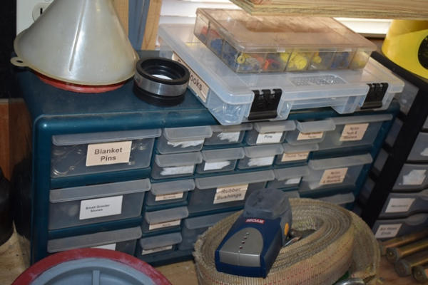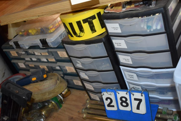 Lot consisting of nylon nuts, washers, nylon bushings, safety pins, wheels, plastic organizer bins